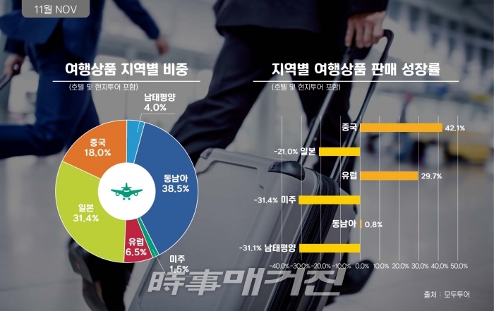 [시사매거진=이성범 기자] ㈜모두투어네트워크(사장 한옥민, 이하 모두투어)가 지난 11월, 17만 1천명의 해외여행(현지투어 및 호텔 포함)과 9만 2천명의 항공권 판매로 전년 동월 대비 마이너스 3% 대의 역성장을 기록했다.