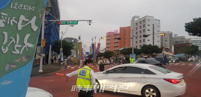 자치경찰단 서귀포지역대 주민봉사대 회원 30여명과 함께 27일 오후 5시 17개 읍·면·동민 2천여 명이 참여한 '칠십리 퍼레이드'가 진행된 천지동 주민센터 교차로에서 지역 주민 및 관광객들의 안전을 위해 관내 자원봉사자 팀들과 교통 통제 봉사 활동을 펼쳤다
