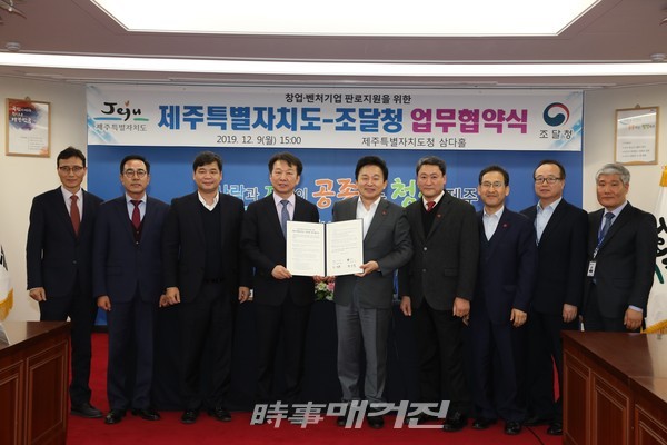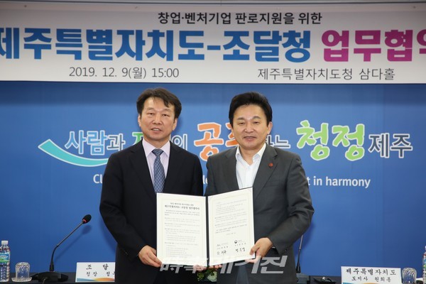 [시사매거진/제주=김연화 기자] 제주특별자치도(도지사 원희룡)와 조달청(청장 정무경)이 9일 오후 제주도청 본관 2층 삼다홀에서 창업·벤처기업의 공공조달시장 판로지원을 위한 업무협약(MOU)를 체결했다.