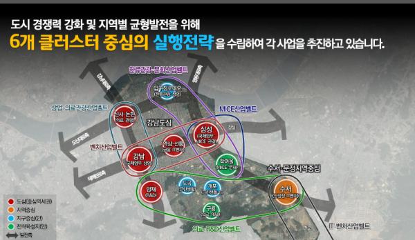 주요내용은 ① 삼성역∼학여울역 일대의 마이스(MICE) 산업 육성을 위한 마이스(MICE) 산업벨트, ② 압구정로데오∼삼성역∼학여울역 일대 중심의 한류관광 및 문화 산업벨트, ③ 신사역·논현역·강남역 일대를 아우르는 상업 및 의료관광 산업벨트, ④ 강남역∼역삼역∼삼성역 일대의 테헤란로를 축으로 형성한 벤처 산업벨트, ⑤ 양재∼도곡∼ 개포∼구룡마을∼수서 역세권 일대를 잇는 의료 및 R&D 산업벨트 그리고 ⑥ 수서역세권 일대로 형성되는 IT 및 벤처 산업벨트까지 총6개 클러스터 상호 작용을 통하여 새로운 지식과 기술을 창출할 수 있도록 기업, 대학, 연구소 따위를 모아 놓은 지역.